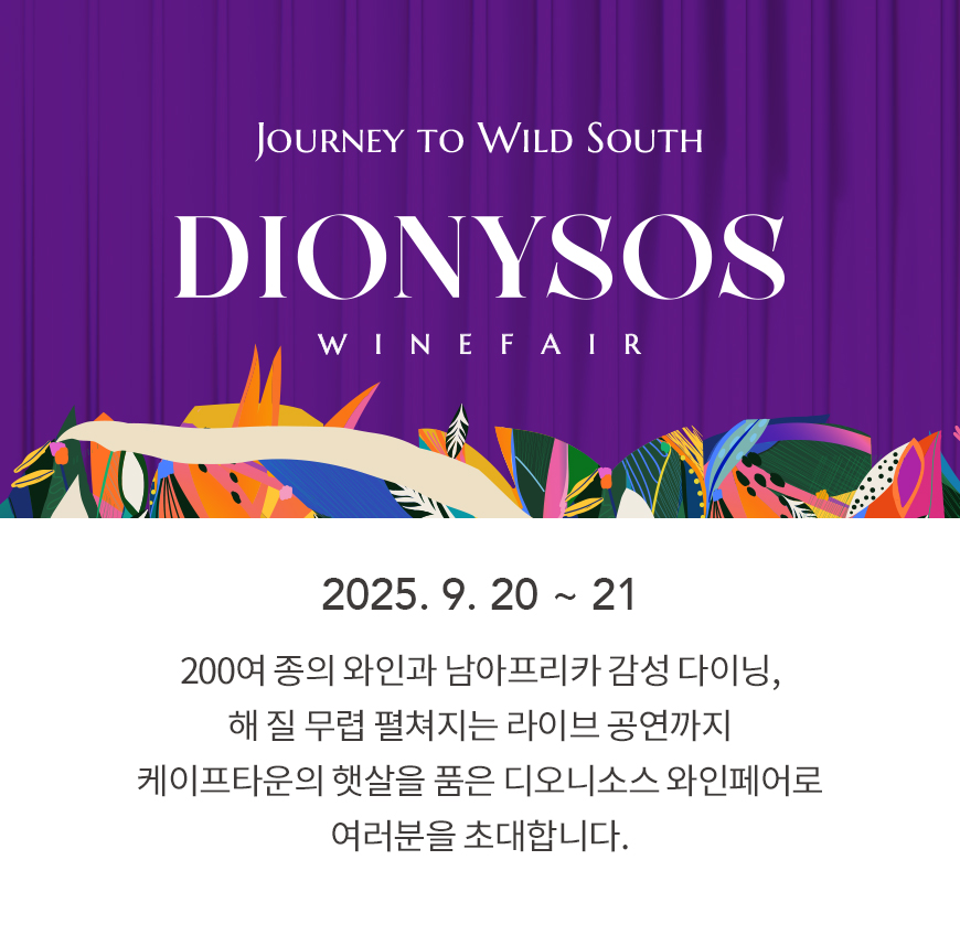 이국적인 야외 정원에서 즐기는 디오니소스 와인페어에서는 다채로운 와인과 셰프가 선보이는 라이브 페어링 메뉴, 에너제틱한 뮤직 퍼포먼스 공연을 선보입니다.